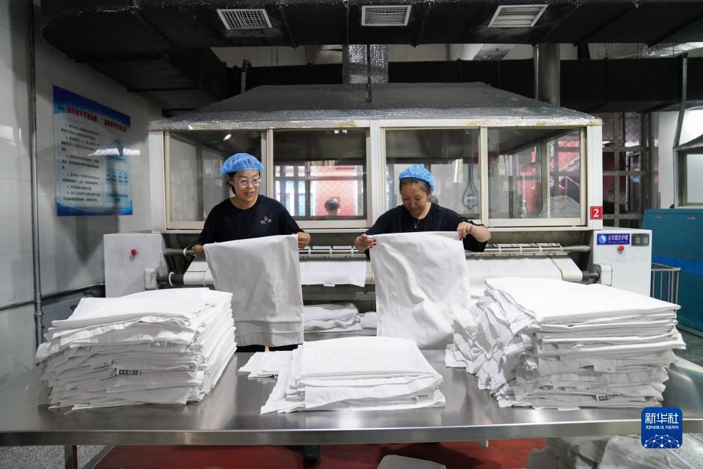 在牡丹江客運段牡(牡丹江)整備車(chē)間,洗滌二班班組成員將烘干后的列車(chē)臥具備品折疊(7月19日攝)。