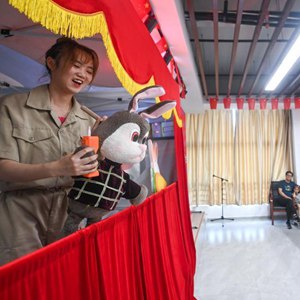 7月20日,在嘉興市秀洲區新塍鎮陡門(mén)村文化禮堂,秀湖音樂(lè )廳小橙堡兒童藝術(shù)劇團在演出兒童劇《紅鼻頭哥哥和小木偶們》。