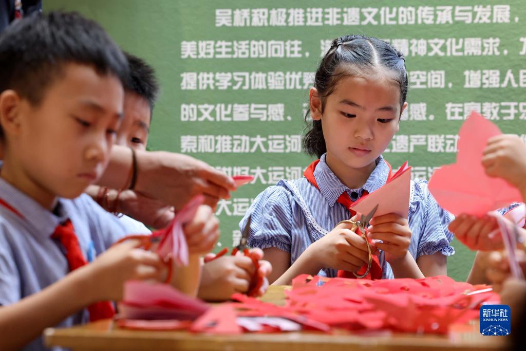 7月20日,在河北省滄州市吳橋縣大運河文化展館,吳橋縣實(shí)驗小學(xué)學(xué)生學(xué)習吳橋雜技剪紙技藝。