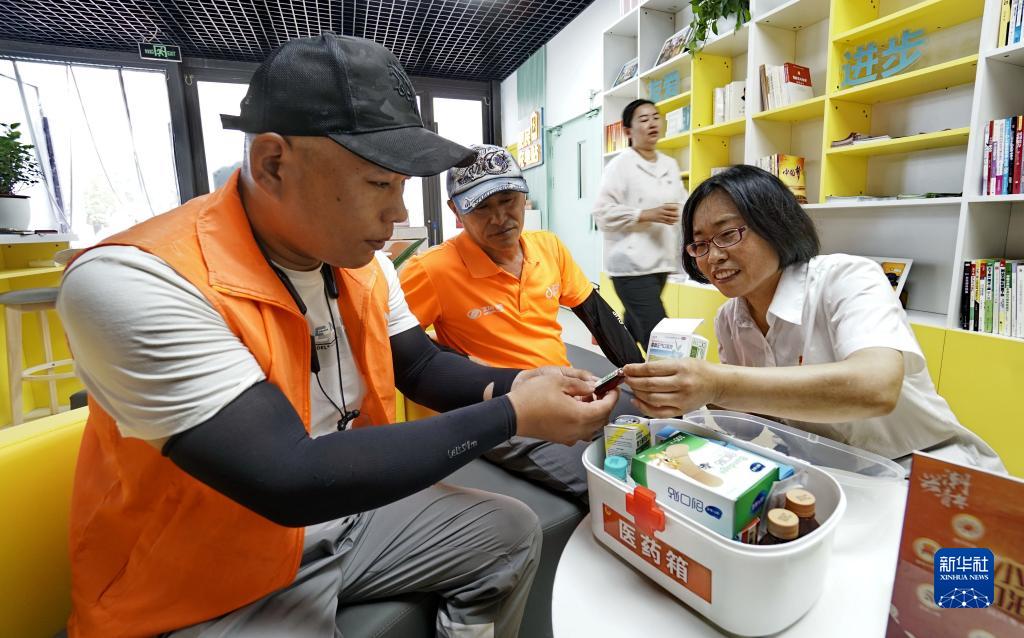 7月19日,北京市大興區天宮院街道一家暖心驛站的工作人員為超市配送員介紹防暑藥品使用方法。