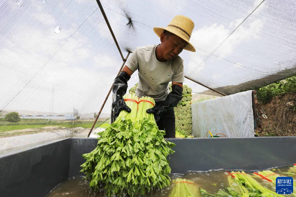 7月20日,甘肅省定西市安定區香泉鎮農民在地頭簡(jiǎn)單清洗蔬菜,準備裝車(chē)。
