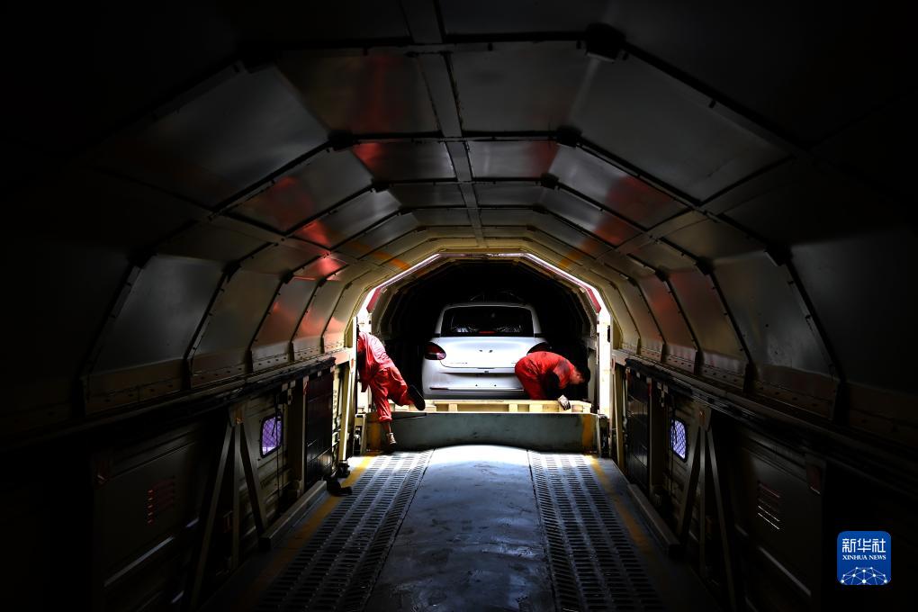 這些小汽車(chē)“乘坐”的火車(chē)是JSQ6型雙層運輸汽車(chē)專(zhuān)用鐵路貨車(chē),每節車(chē)廂兩端都可以打開(kāi),在車(chē)廂連接處鋪上擋板,相鄰的車(chē)廂就可以連起來(lái)形成通道。每節車(chē)廂可以裝載9至15輛小汽車(chē)。其中一部分小汽車(chē)會(huì )“坐”著(zhù)火車(chē),通過(guò)鐵海聯(lián)運班列運往海外。