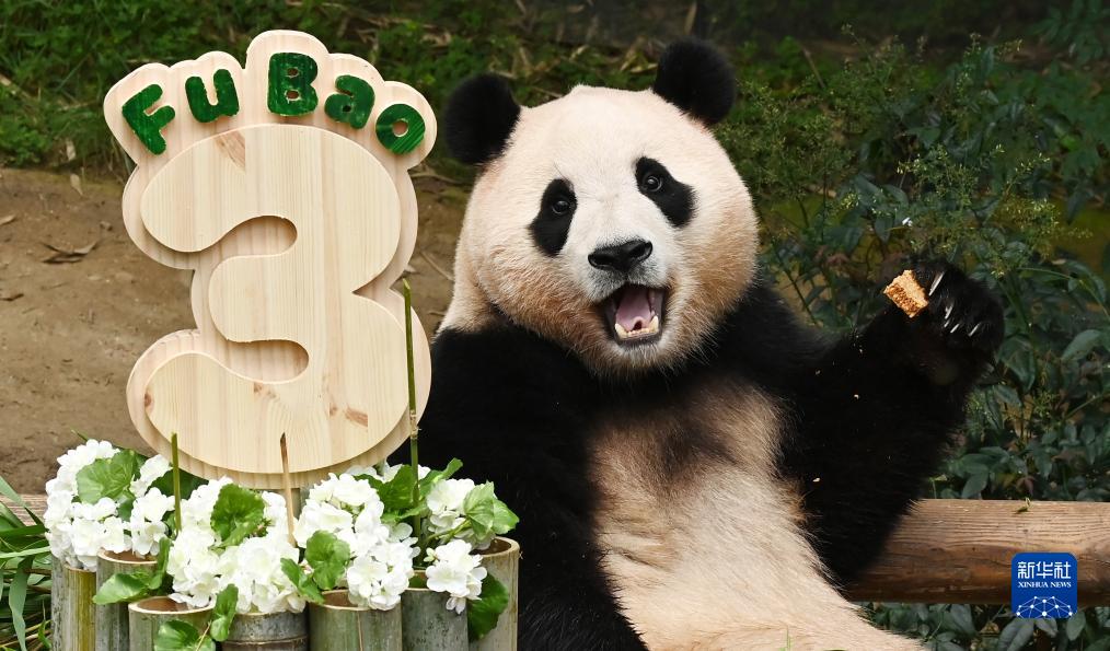 當日,在韓國出生的大熊貓“福寶”迎來(lái)3歲生日,園區制作了由竹子和胡蘿卜組成的“蛋糕”為其慶生。