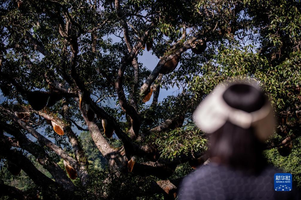 游客在瀾滄縣景邁山參觀(guān)一棵枝干上筑有數十個(gè)蜂巢的榕樹(shù),當地也稱(chēng)此樹(shù)為“蜂王樹(shù)”(7月18日攝)。
