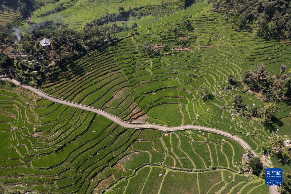 這是7月20日在印度尼西亞西爪哇省茂物地區的鄉間拍攝的稻田(無(wú)人機照片)。當前正值稻米收獲季。
