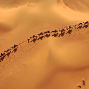 7月20日,游客在寧夏中衛市沙坡頭景區體驗沙漠騎駱駝(無(wú)人機照片)。