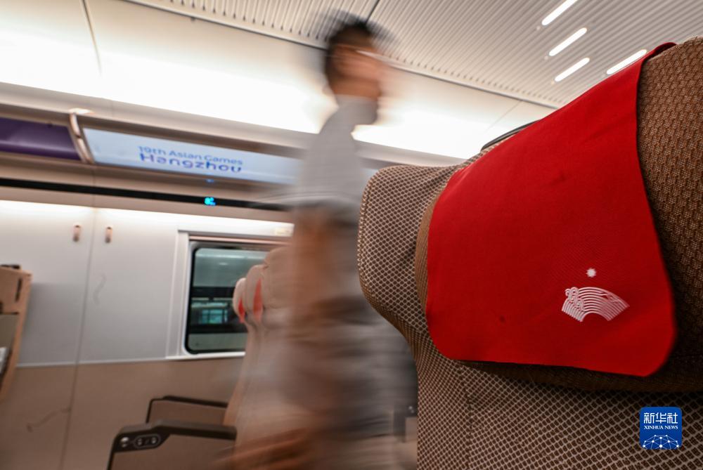 這是7月21日在中車(chē)長(cháng)春軌道客車(chē)股份有限公司拍攝的復興號亞運智能動(dòng)車(chē)組內飾。