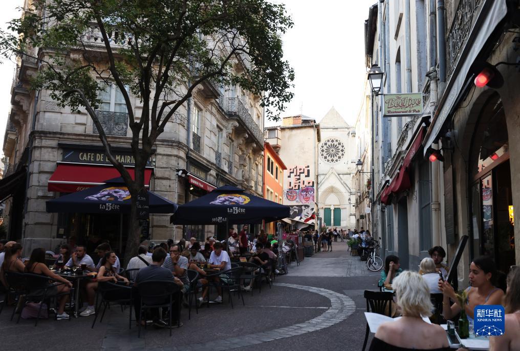 7月17日,人們在法國蒙彼利埃街頭就餐休閑。