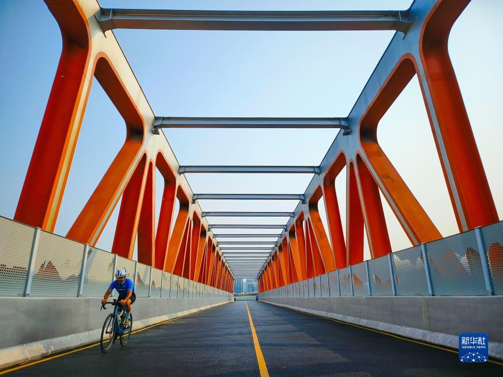 人們在成都錦城湖附近的綠道騎行(6月25日攝)。