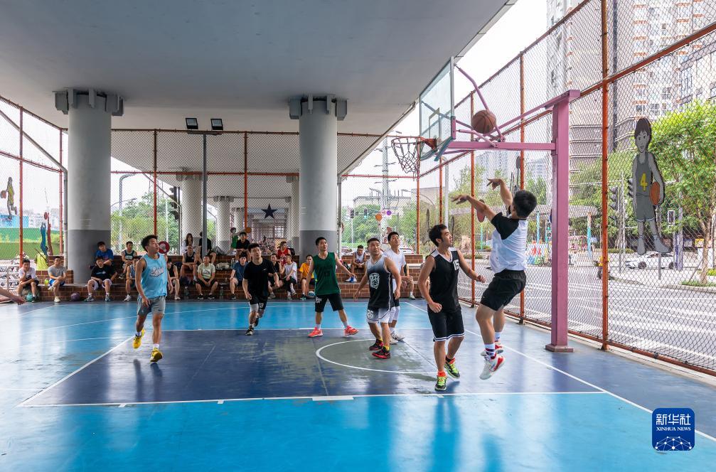 人們在成都市府青路立交橋下的運動(dòng)空間打籃球(2022年6月12日攝)。