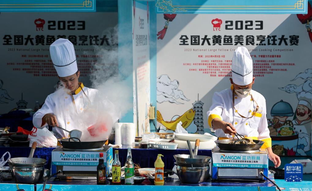 廚師在寧德首屆全國大黃魚(yú)美食烹飪大賽上烹飪大黃魚(yú)(4月9日攝)。