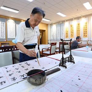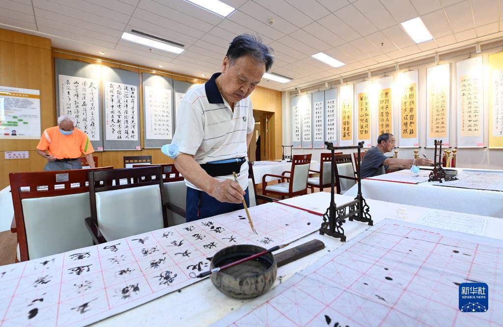 河北廊坊三河市燕達金色年華健康養護中心入住老人在活動(dòng)室練習書(shū)法(7月20日攝)。