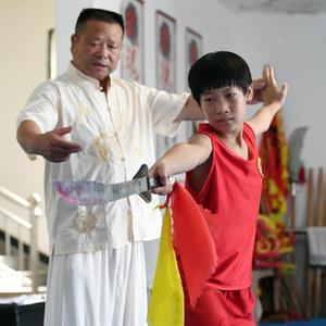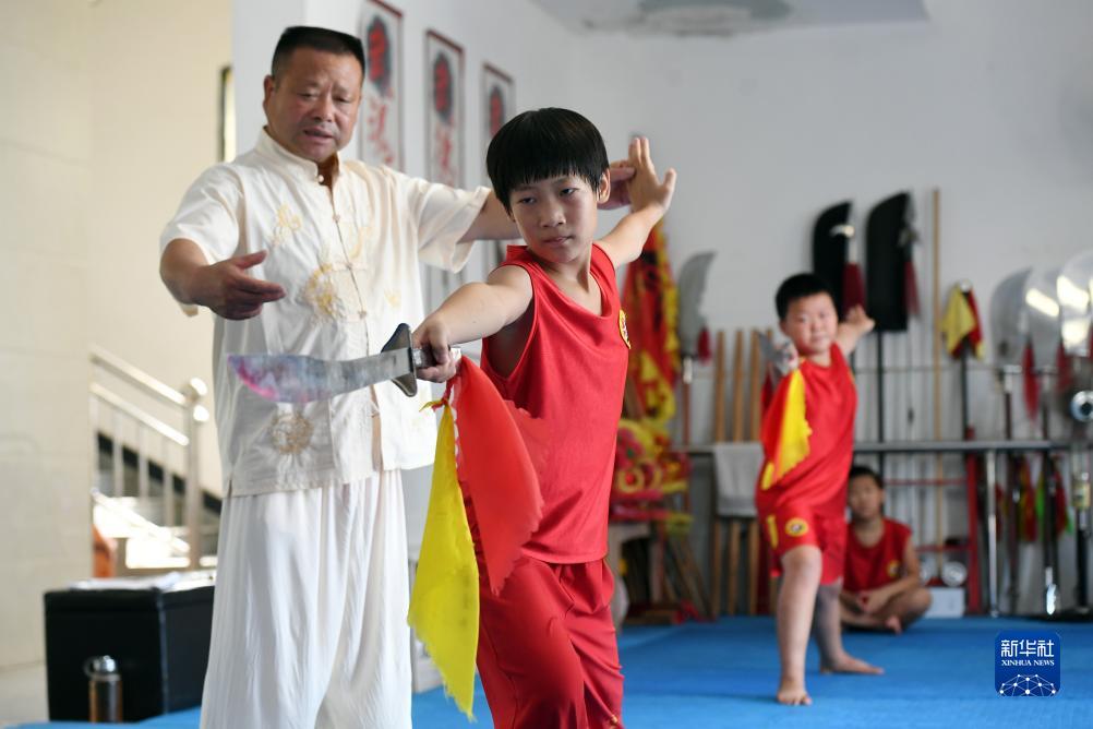7月21日,在江西省宜春市袁州區南廟鎮白馬村鄉村武館,孩子在武術(shù)教練的指導下進(jìn)行武術(shù)器械練習。