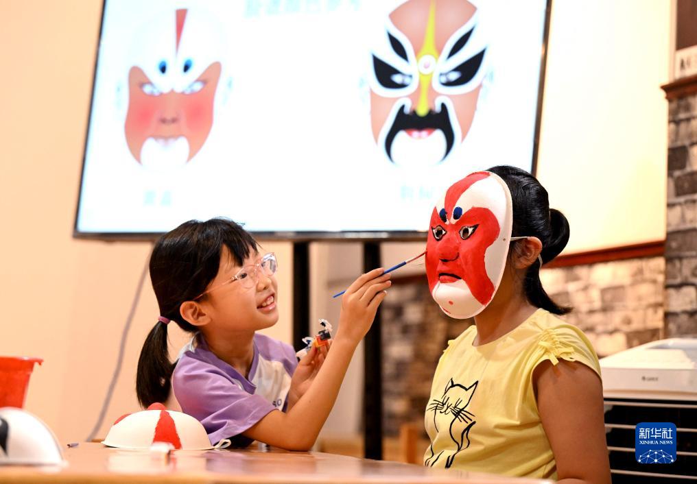 7月21日,小朋友在河北省石家莊市橋西區冀臺聯(lián)文化產(chǎn)業(yè)園學(xué)習臉譜制作技藝。