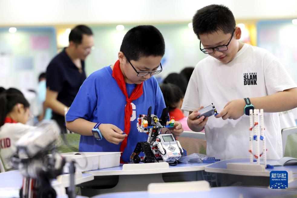 7月21日,在安徽省合肥市郎溪路小學(xué)少年宮,孩子們在暑期科創(chuàng )課上組裝機器人。