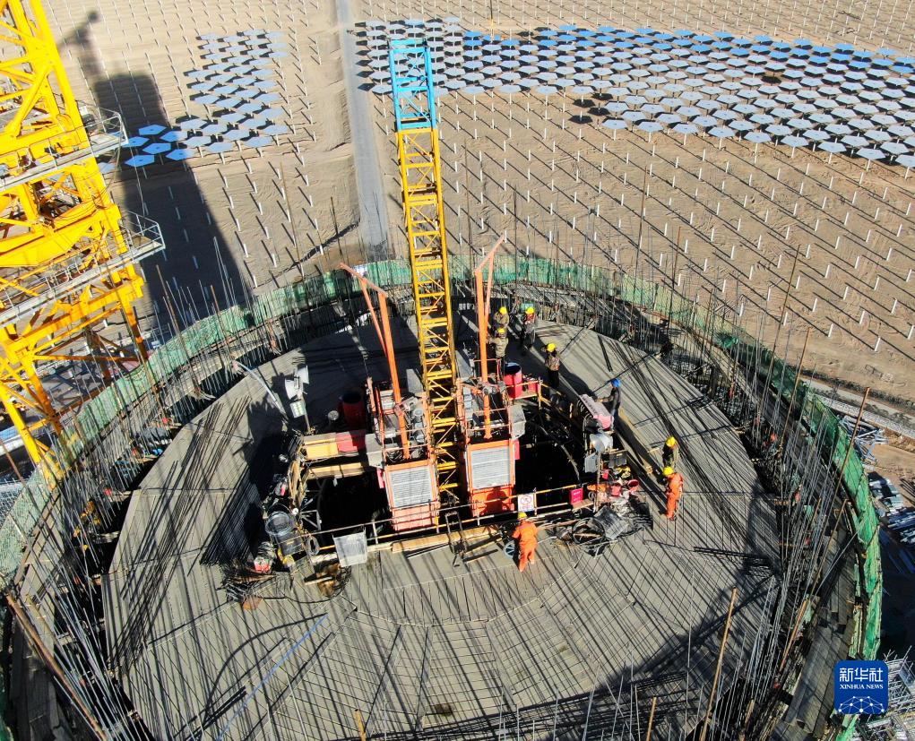 7月21日,在阿克塞千萬(wàn)千瓦級可再生能源多能互補基地,工人在匯東新能源75萬(wàn)千瓦光熱+項目建設現場(chǎng)施工(無(wú)人機照片)。