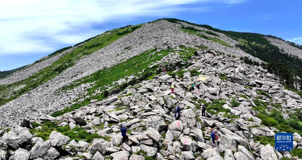 陜西朱雀國家森林公園內,游人在向峰頂攀爬(7月21日攝,無(wú)人機照片)。
