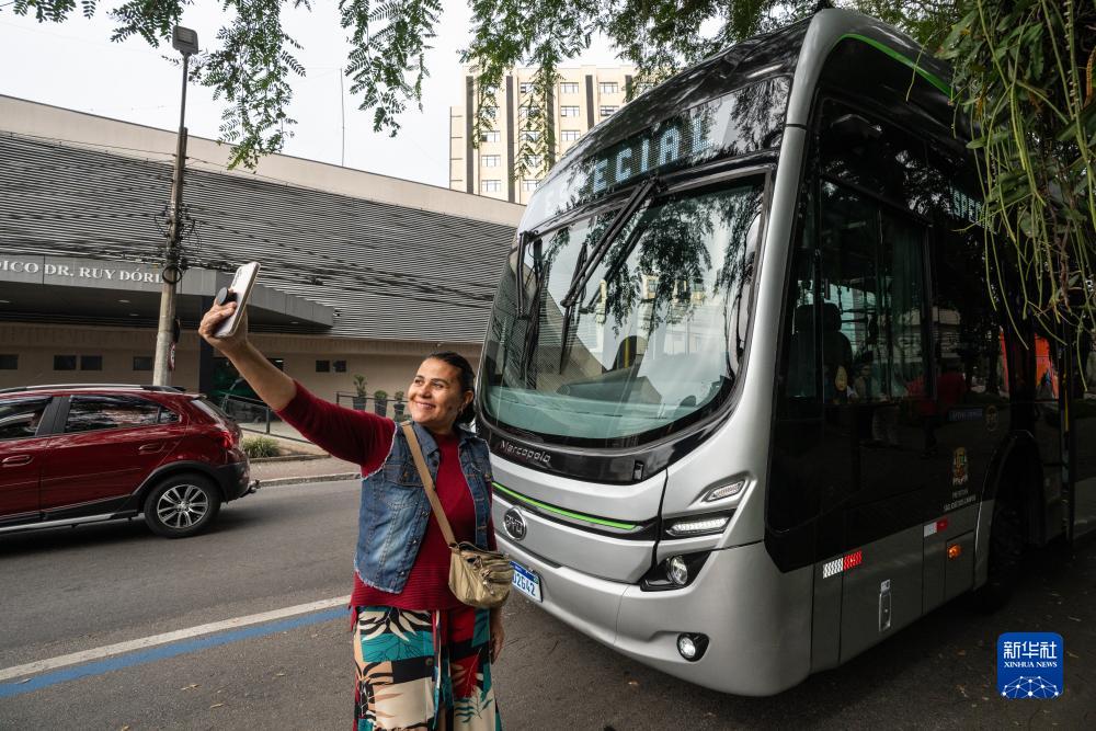 7月12日,在巴西圣保羅州圣若澤杜斯坎普斯,游客與比亞迪純電動(dòng)大巴合影。
