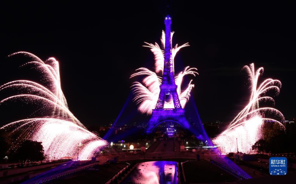 7月14日,焰火在法國巴黎埃菲爾鐵塔周?chē)`放。