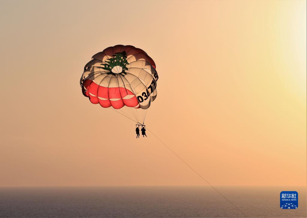 7月19日,在黎巴嫩首都貝魯特,游客在海邊乘滑翔傘游覽。