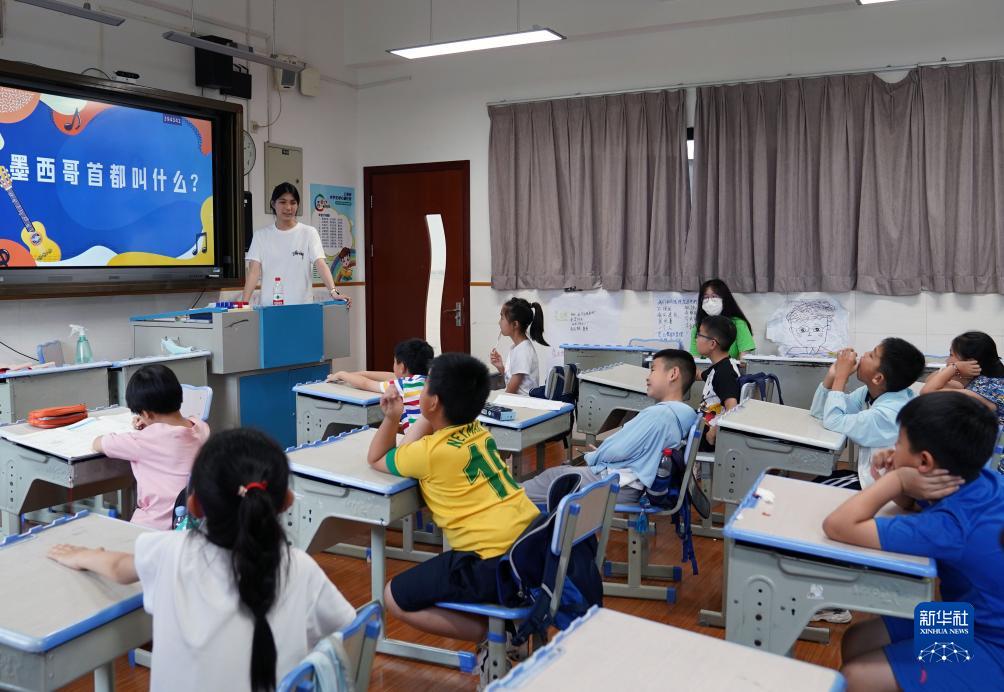 7月19日,在萬(wàn)里城實(shí)驗學(xué)校,小學(xué)生愛(ài)心暑托班“新業(yè)態(tài)新就業(yè)群體子女專(zhuān)班”的孩子們在“21天環(huán)游世界”特色課堂上,了解世界各國的地理常識并進(jìn)行互動(dòng)游戲。
