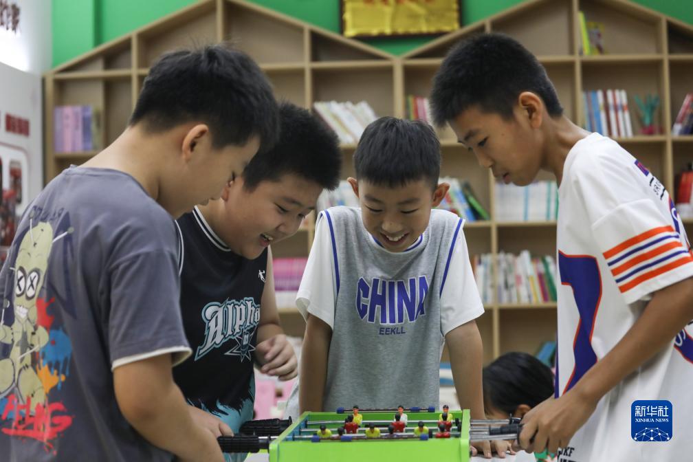 7月21日,幾名小學(xué)生在山東省樂(lè )陵市市中街道南鑫社區新時(shí)代文明實(shí)踐站暑期托管班進(jìn)行桌式足球游戲。