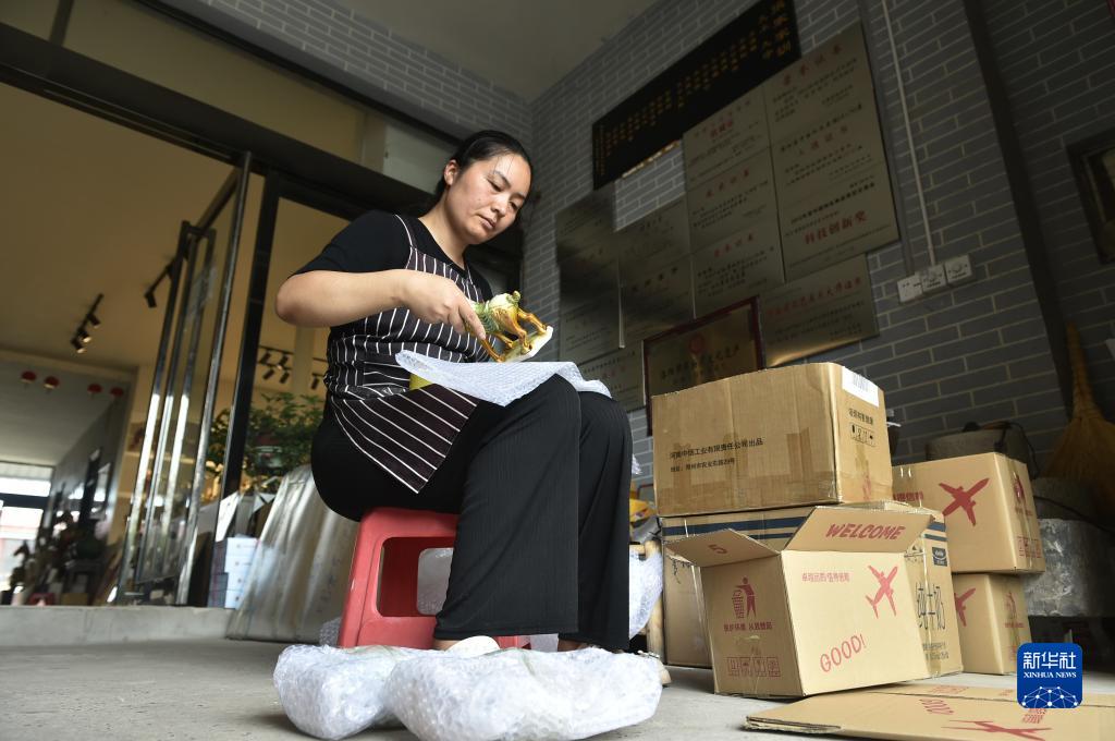 7月20日,南石山村一家唐三彩生產(chǎn)企業(yè)的工人在打包唐三彩作品準備外銷(xiāo)。