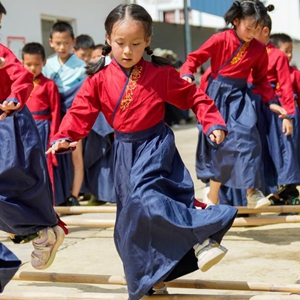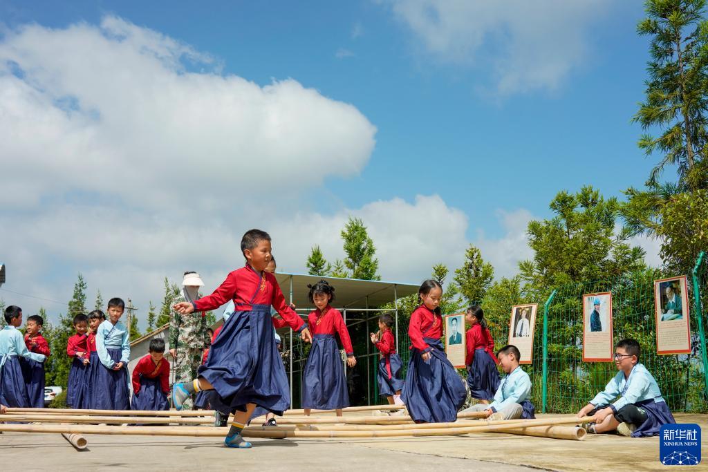 7月22日,萬(wàn)州區恒合土家族鄉一個(gè)研學(xué)基地內,參加暑期避暑研學(xué)活動(dòng)的學(xué)生在練習傳統體育運動(dòng)跳竹竿。