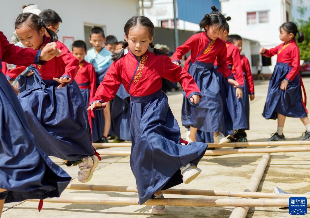7月22日,萬(wàn)州區恒合土家族鄉一個(gè)研學(xué)基地內,參加暑期避暑研學(xué)活動(dòng)的學(xué)生在練習傳統體育運動(dòng)跳竹竿。