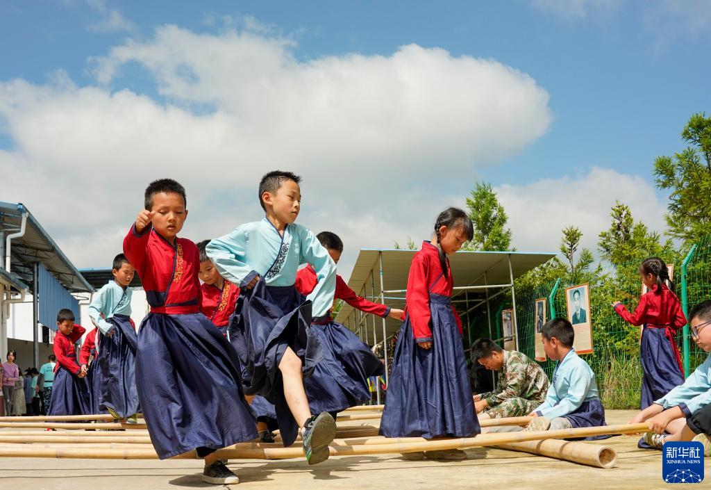 7月22日,萬(wàn)州區恒合土家族鄉一個(gè)研學(xué)基地內,參加暑期避暑研學(xué)活動(dòng)的學(xué)生在練習傳統體育運動(dòng)跳竹竿。
