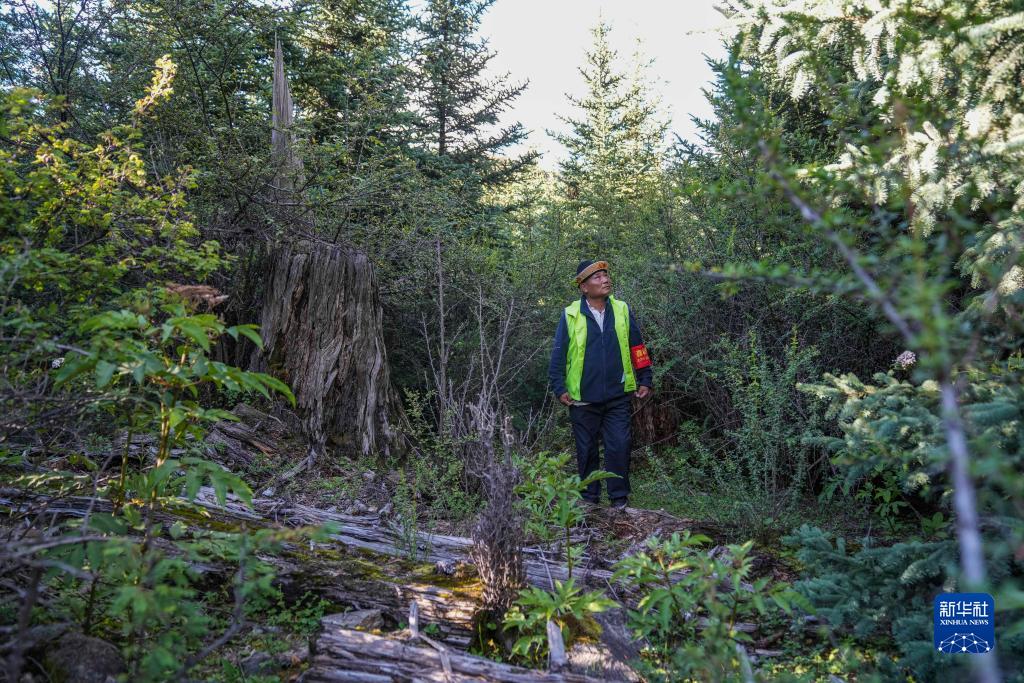 結巴村村民索朗班旦在林間巡邏(7月20日攝)。