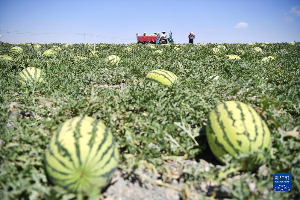 農戶(hù)在中衛市沙坡頭區香山鄉收獲硒砂瓜(7月21日攝)。