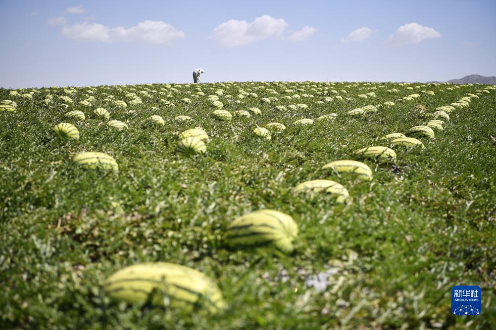 農戶(hù)在中衛市沙坡頭區香山鄉收獲硒砂瓜(7月21日攝)。