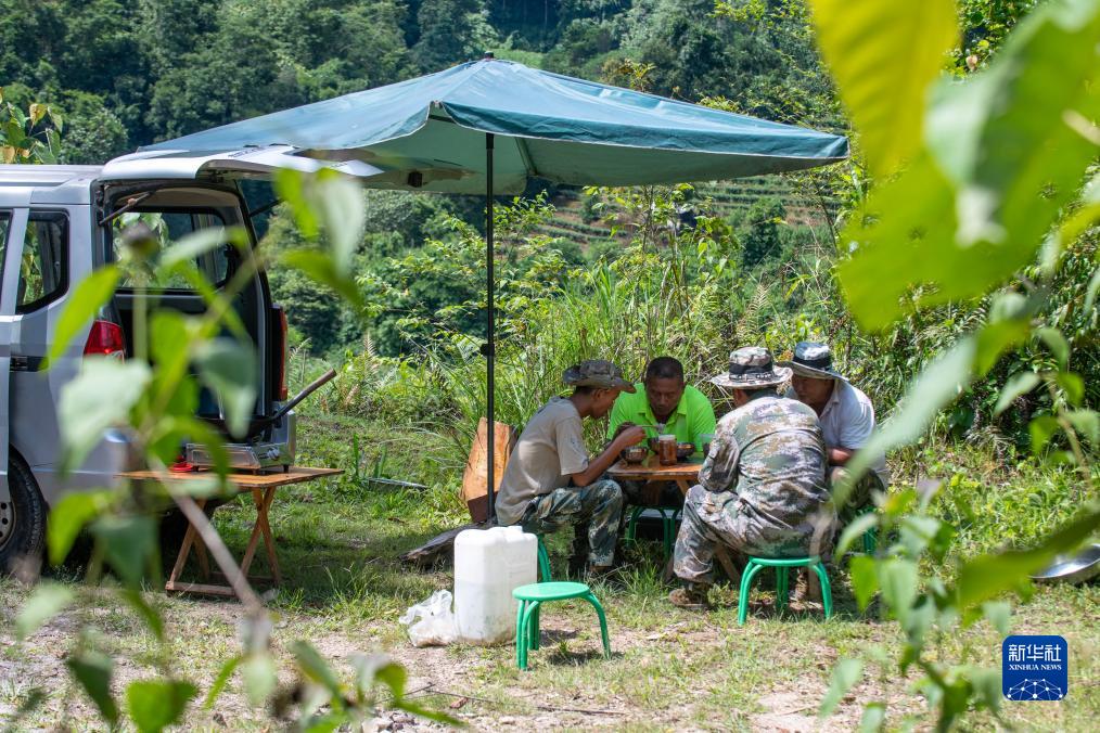 刁發(fā)興(左二)和監測隊隊員在“生活車(chē)”旁用餐(7月20日攝)。