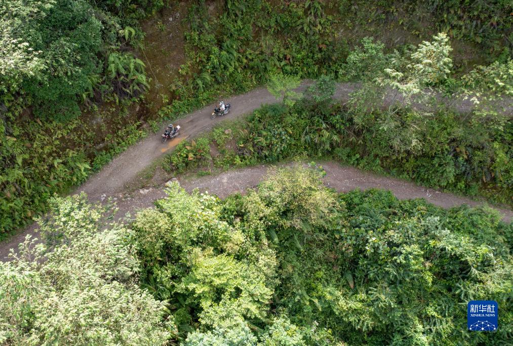 兩名監測隊隊員騎著(zhù)摩托車(chē)去監測野象(7月20日攝,無(wú)人機照片)。