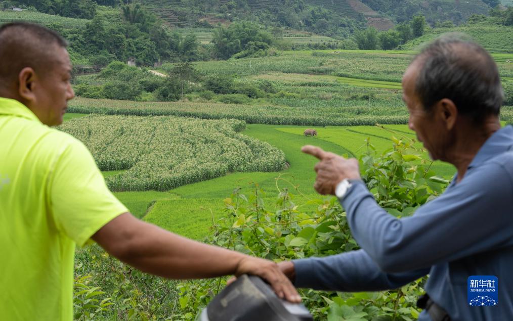 7月19日,刁發(fā)興(左)和村民交流亞洲象的情況。