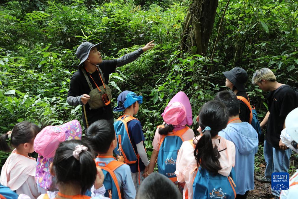 7月22日,來(lái)自京滬兩地的學(xué)生和家長(cháng)在云南西雙版納的雨林中聽(tīng)科普導游介紹雨林生態(tài)常識。