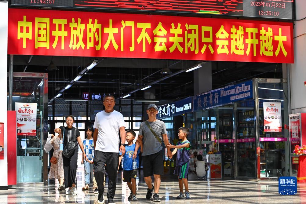 游客在新疆塔城巴克圖中哈邊民互市絲路文化商品城參觀(guān)游覽(7月22日攝)。