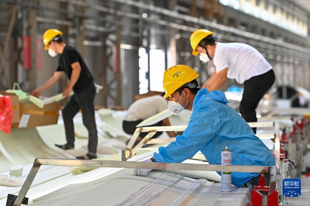 在新疆塔城重點(diǎn)開(kāi)發(fā)開(kāi)放試驗區先行發(fā)展區三一(塔城)風(fēng)電設備有限公司,工人在葉片成型車(chē)間忙碌(7月22日攝)。