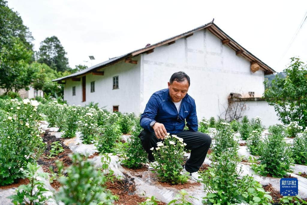 朱大清在地里查看自己種植的藥用菊花(7月19日攝)。