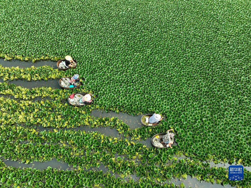 7月23日,江蘇省泰州市姜堰區婁莊鎮三聯(lián)村的農民劃著(zhù)木桶在菱塘采摘菱角(無(wú)人機照片)。