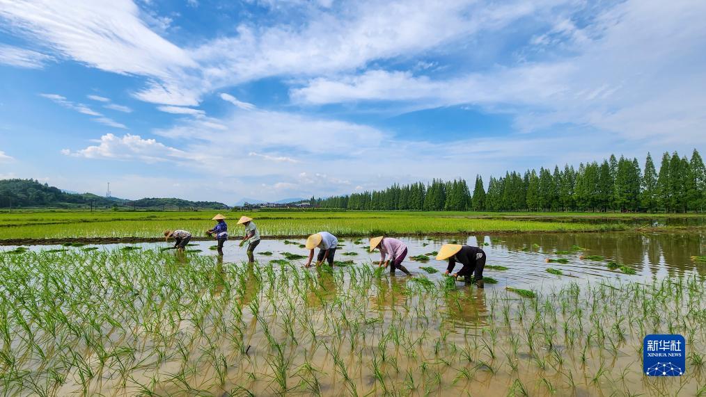 7月23日,在湖南省常寧市三角塘鎮長(cháng)江村,村民在搶插晚稻。