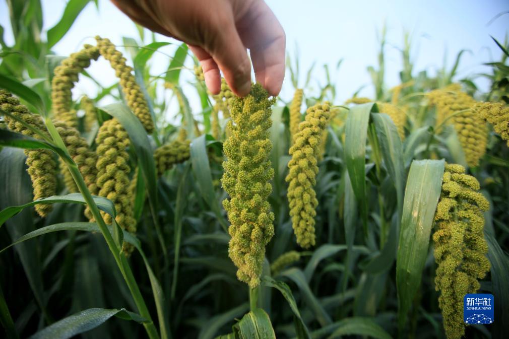 7月23日,山東省臨沂市平邑縣地方鎮西瑤草村村民在查看谷子長(cháng)勢。