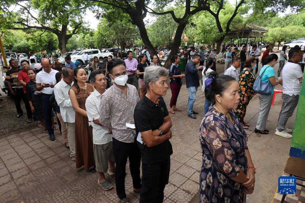 7月23日,選民在柬埔寨首都金邊一處投票站排隊投票。
