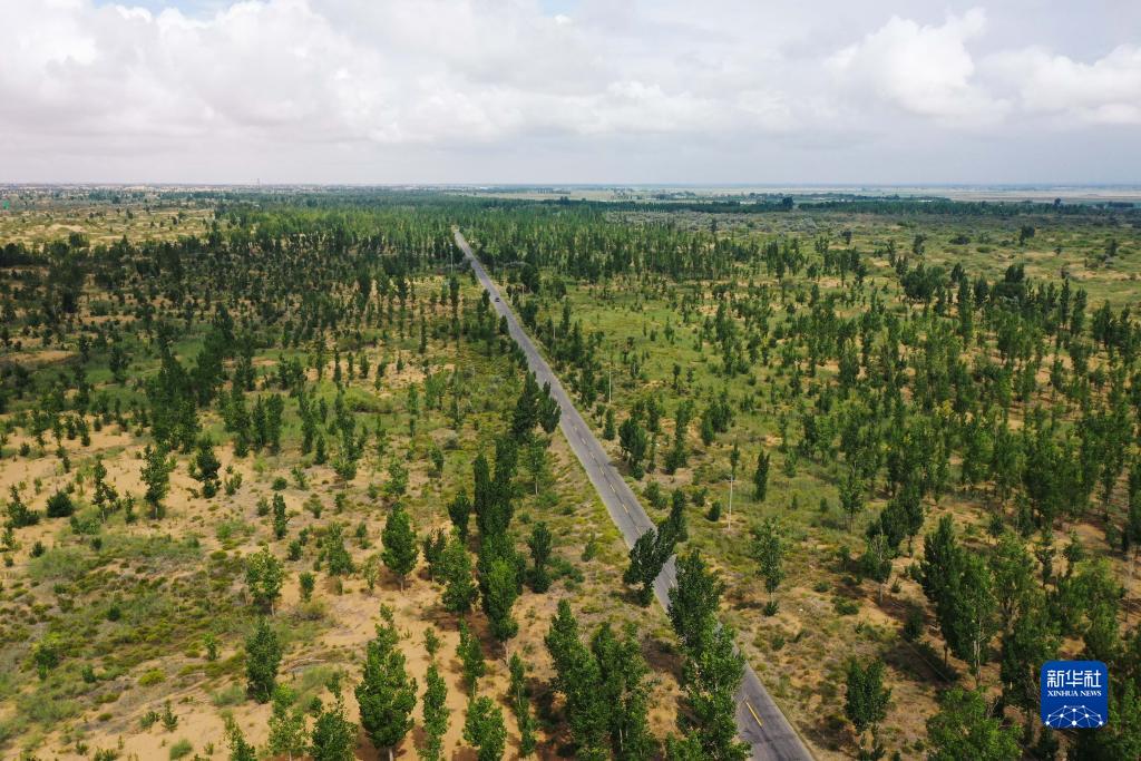 夏日時(shí)節,內蒙古自治區杭錦旗境內的穿沙公路綠意盎然,綠色沿著(zhù)道路前行,并向兩旁的沙地鋪展,猶如一條條“綠色動(dòng)脈”在庫布其沙漠中綿延。