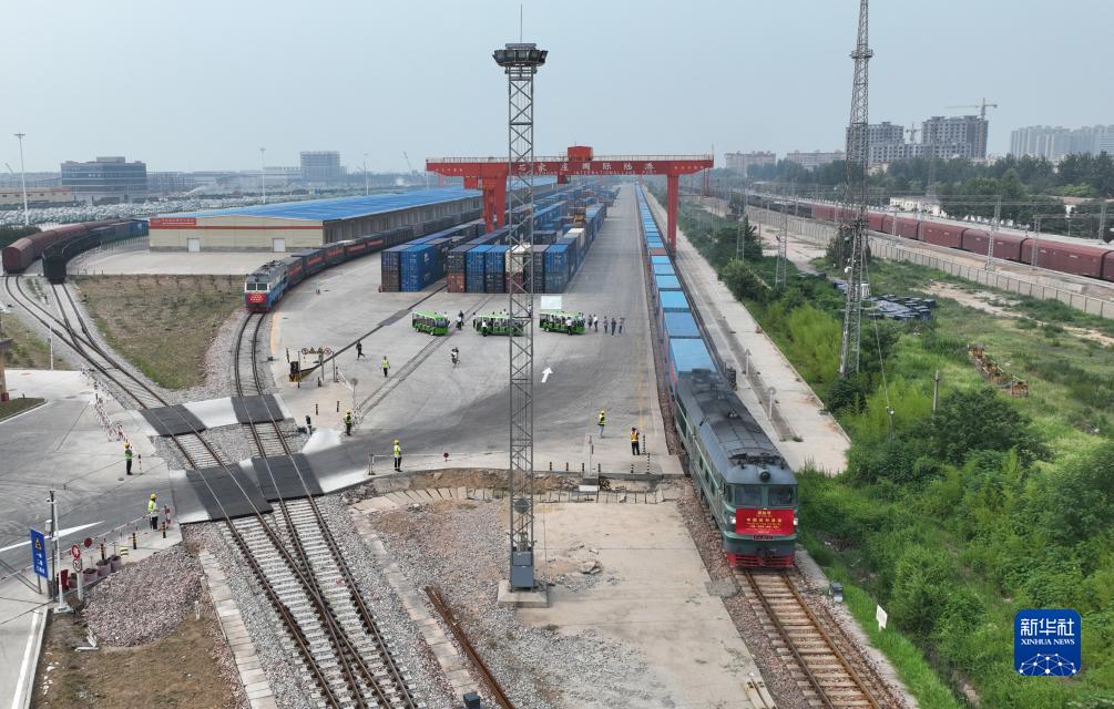 7月24日,“燕趙號”中越班列從河北省石家莊國際陸港駛出(無(wú)人機照片)。