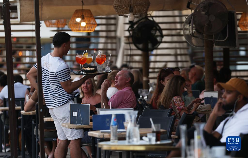 7月18日,人們在法國蒙彼利埃喜劇廣場(chǎng)附近就餐休閑。