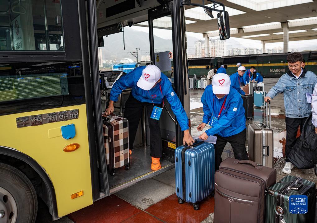 7月24日,在拉薩火車(chē)站,工作人員幫剛剛抵達拉薩的志愿者搬運行李。