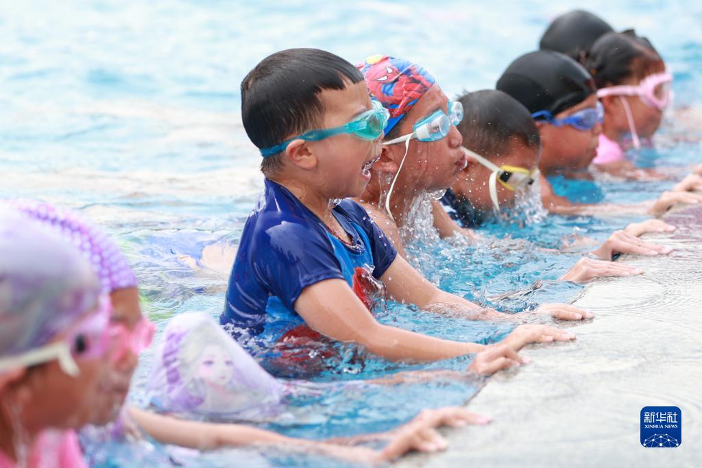 7月24日,在貴州省黔東南苗族侗族自治州岑鞏縣一家游泳館,小朋友在教練的指導下練習潛水。