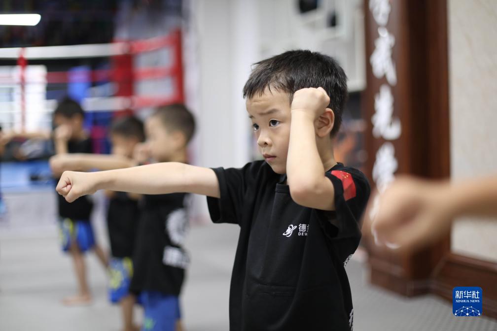 7月24日,在湖南省永州市道縣一家搏擊館,小朋友練習搏擊動(dòng)作。